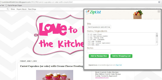 When you find a recipe you want to keep, make sure you are on the page for that recipe, (so instead of the homepage, click on the post for that specific recipe, see how instead of being at lovetobeinthekitchen.blogspot.com it's at this address: http://lovetobeinthekitchen.blogspot.com/2012/06/carrot-cupcakes-or-cake-with-cream.html because that is specific to the recipe post) and then click the Recipe Clipper button in your toolbar.